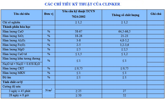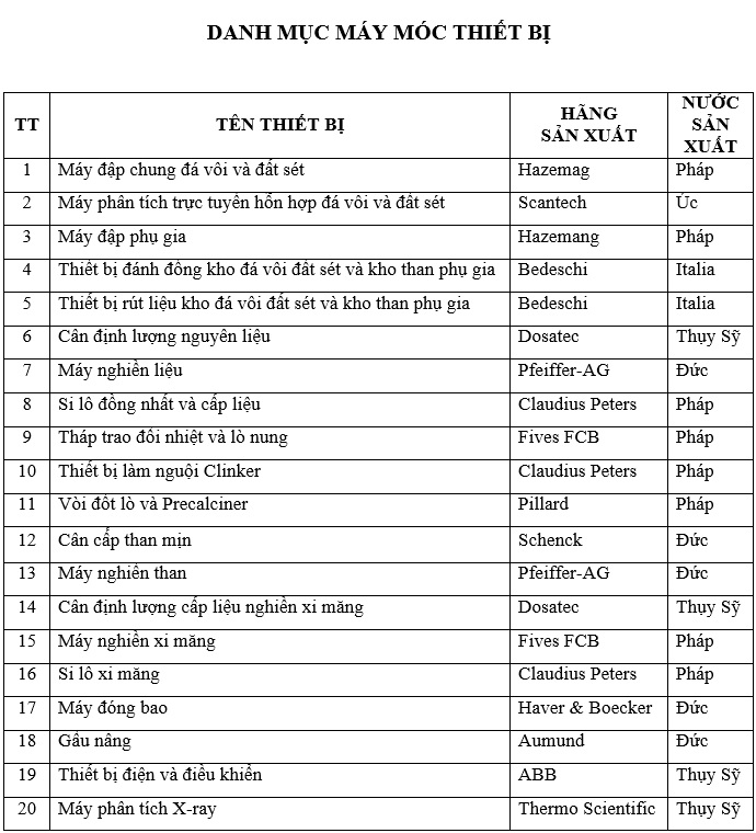 - Dự án sử dụng công nghệ lò quay theo phương pháp khô, thiết bị công nghệ sản xuất tiên tiến trên thế giới hiện nay, tiết kiệm tiêu hao nhiên liệu, điện năng với chỉ tiêu kỹ thuật chính: tiêu hao nhiệt năng Q =< 730 Kcal/kg clanhke; tiêu hao điện năng =< 95 KWh/tấn xi măng; nồng độ bụi khí thải từ miệng các ống khói =< 30 mg/Nm3. Các chỉ tiêu khác về nước thải, độ ồn, chất thải rắn phù hợp với Luật Bảo vệ môi trường của Việt Nam.